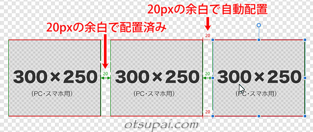 そこにレイヤーをもう1枚同じ余白で追加したい場合、近づけるだけで自動で20pxあけてピタッと配置してくれます。