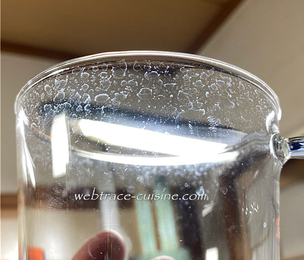 その結果どうなるかというと、下の画像でもわかるようにガラスの上のふち部分に水垢がついてしまうんです。