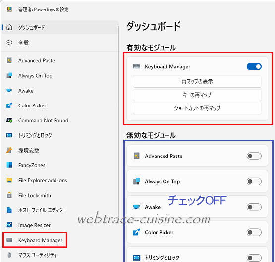 一時的に『Keyboard Manager』の機能を無効化しておきたい時は、有効化ボタンをOFFにしておきます。